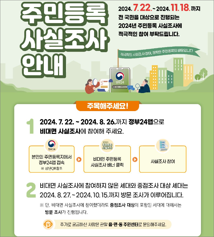 2024년 전국민 대상 주민등록 사실조사 안내입니다. 정당한 사유없이 조사에 불응하면 과태료가 부과되므로 조사기간에 반드시 참여해아 합니다. 비대면 조사를 이용하면 간단하게 참여할 수 있습니다.